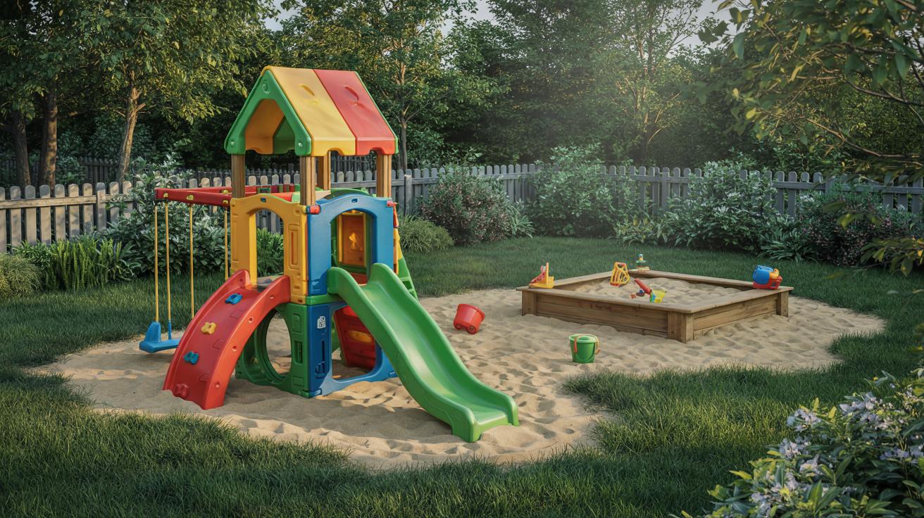Slides with built-in storage offer a blend of fun and neatness. A playhouse combined with a sandbox creates two play zones in one footprint. This arrangement encourages imaginative play while keeping sand contained.