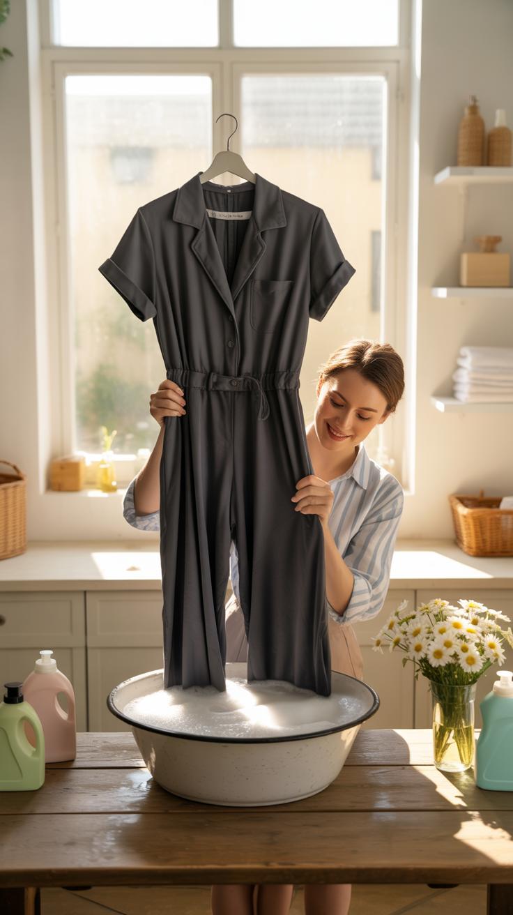 To keep the deep black tone intact, a good trick I’ve found is to turn the jumpsuit inside out before washing. It lessens abrasion on the surface. And don’t soak it for too long; that tends to bring out unwanted fading.
