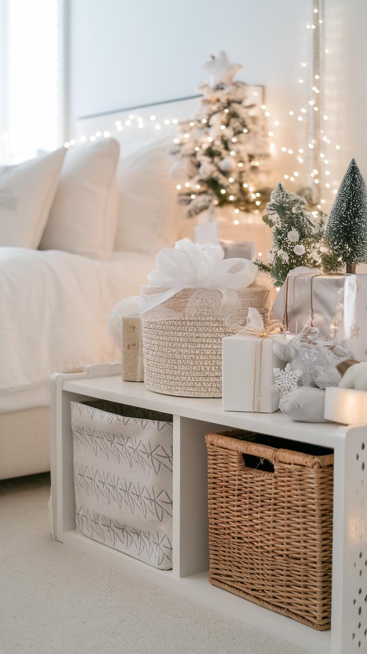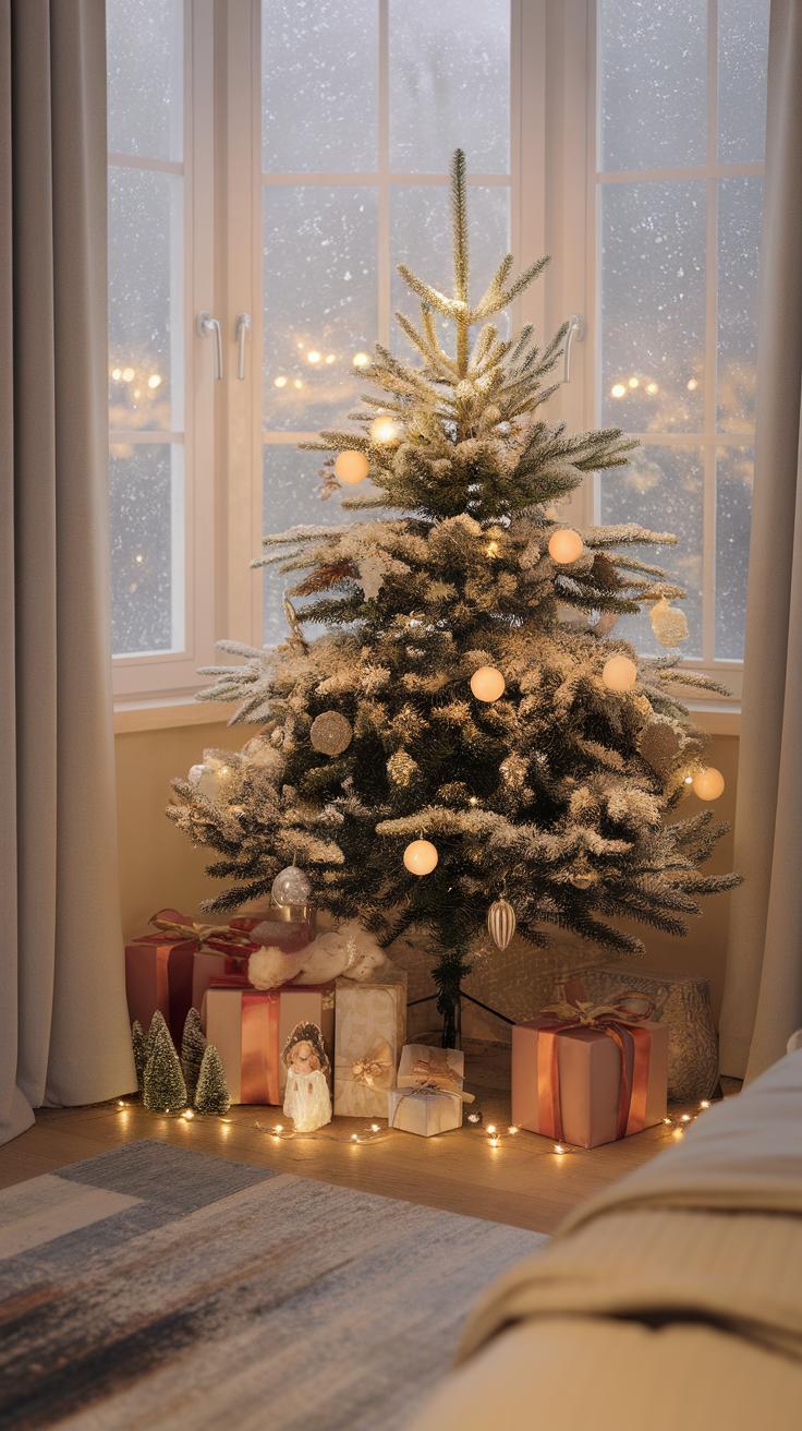 Choose a theme for your tree that matches your room’s style. A traditional red and green color scheme brings classic holiday cheer. Alternatively, you could opt for a winter wonderland theme with silver and white decorations. Use small ornaments and a few whimsical touches like candy canes or mini presents that fit the tree’s overall look. Add a soft tree skirt to complete the corner. By enhancing your nook with thoughtful decorations, you create a warm and inviting atmosphere that brightens your bedroom.