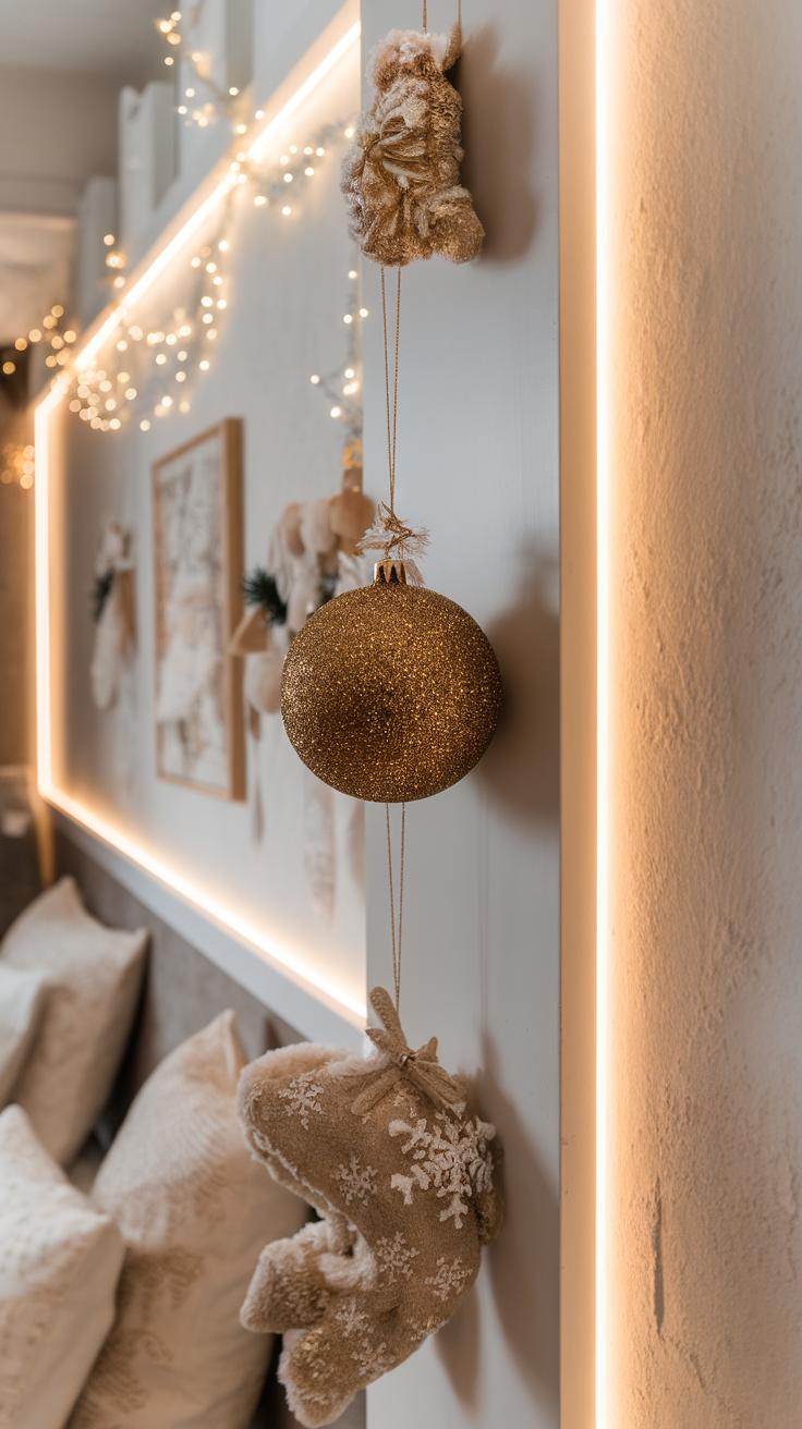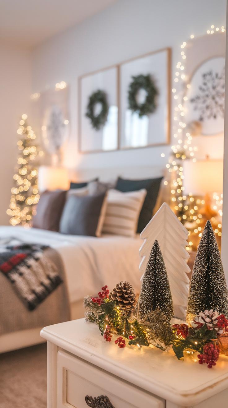 Another idea includes hanging wreaths made from colorful ornaments or lush greenery. These can brighten up your wall and bring a touch of nature indoors. You can also create a gallery wall using framed holiday cards or DIY artwork that reflects your personality. Strings of fairy lights can enhance these decorations, adding warmth to the room. Each piece you choose should reflect the joy and cheer the season brings, transforming your bedroom into a festive retreat.