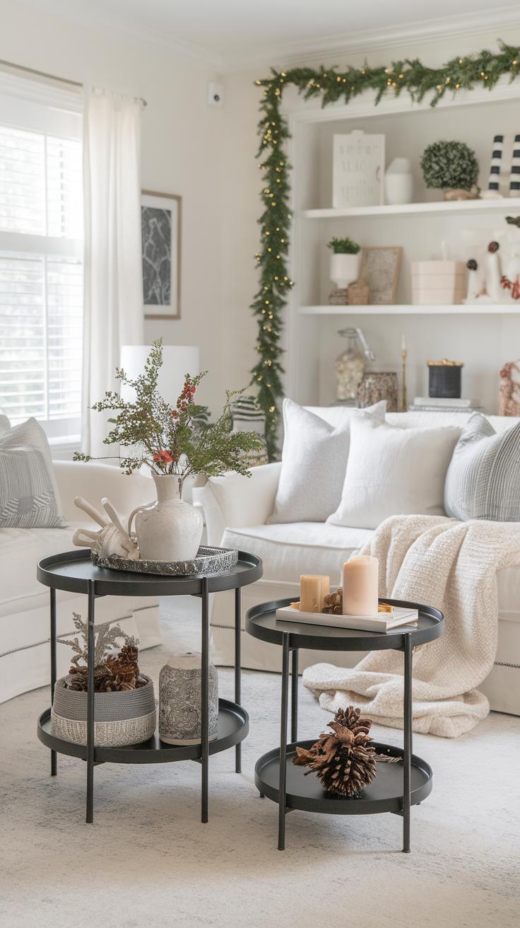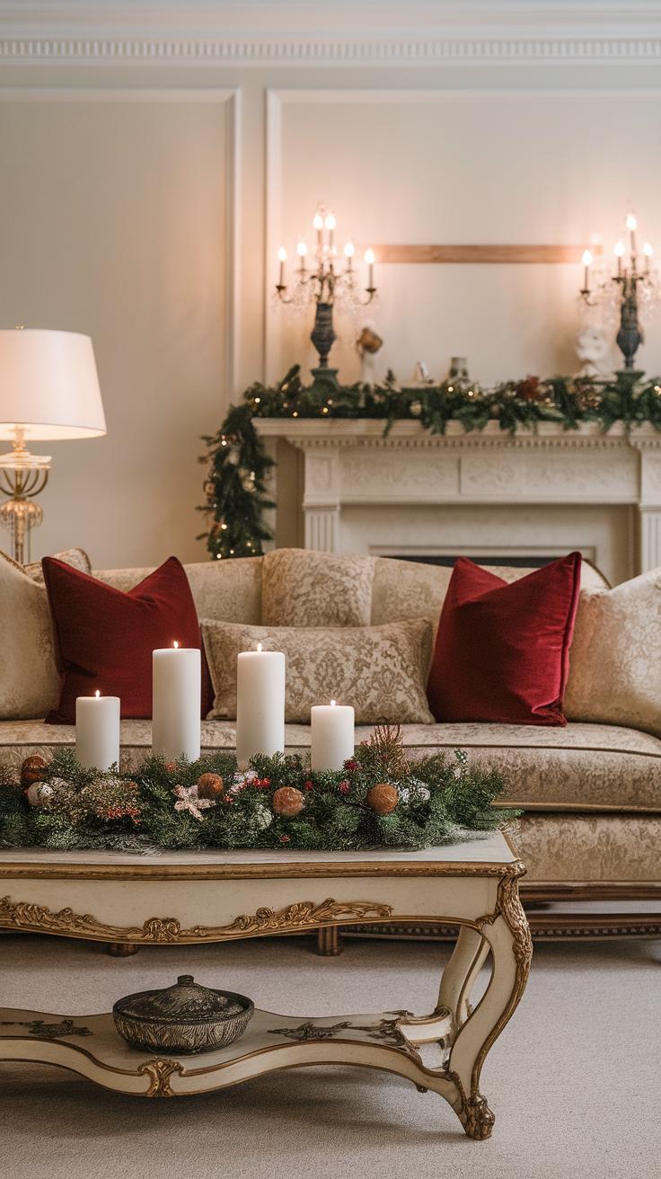 Integrating materials like wood, stone, and metal can enhance the festive ambiance. A rustic coffee table made of reclaimed wood provides a grounding effect, while metallic elements, like ornaments or candle holders, can add a touch of shine. You may also want to add woven baskets for additional storage and texture. The contrast between smooth and rough surfaces fosters a sense of comfort, making your living room feel warm and inviting during the holiday season.