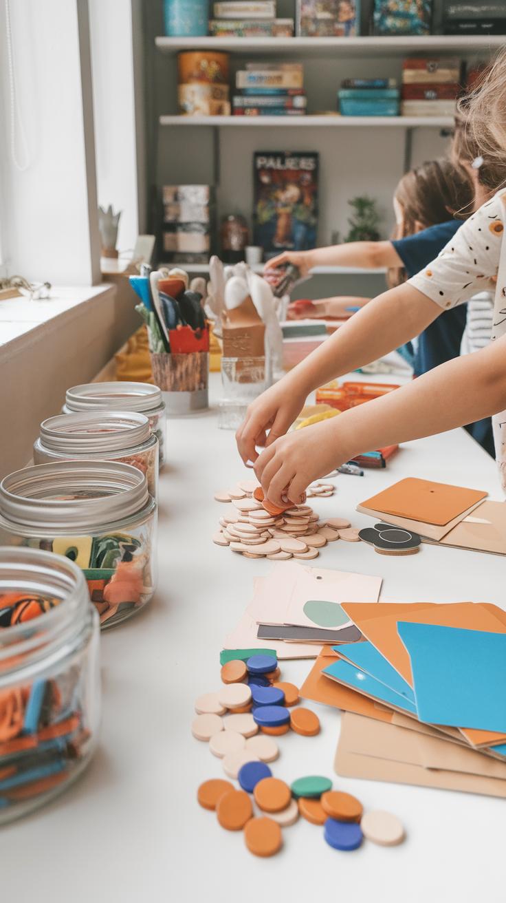 Choose a small corner or a table to create the craft zone. Use containers or jars to separate materials by type, so kids find what they need quickly. Covering the table with newspaper or a washable mat helps keep things tidy.