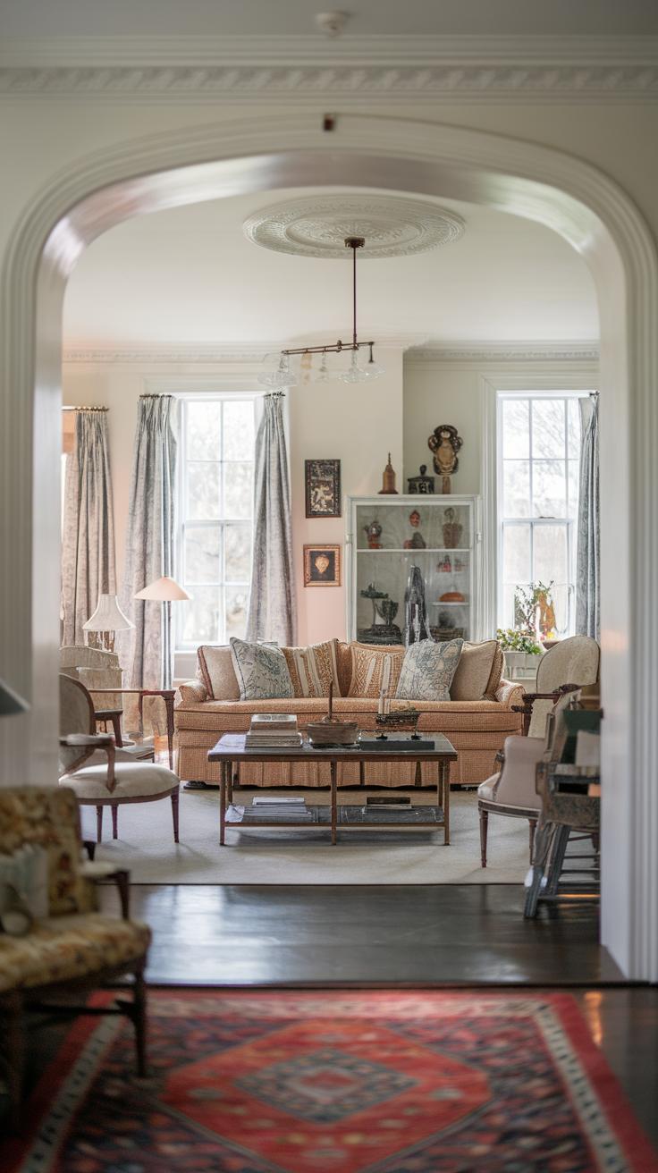 Gather vintage and hand-me-down items. These pieces can tie the room together and tell a story. Blend floral patterns with lace and handmade blankets. Arrange furniture to foster conversation and connection, centering seating around a warm light or a fireplace.