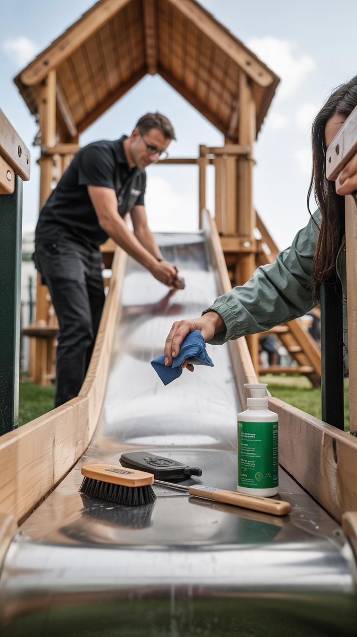 Cleaning is key to extending playground life and preventing hazards. Use mild soap and water to wash plastic and metal parts, rinsing thoroughly. Wooden structures benefit from light sanding and resealing every year to fight weather damage. Cover equipment or use protectants to block harsh sunlight and heavy rain, which wear down materials faster. Before winter, remove toys and dismantle loose parts that could freeze or warp.