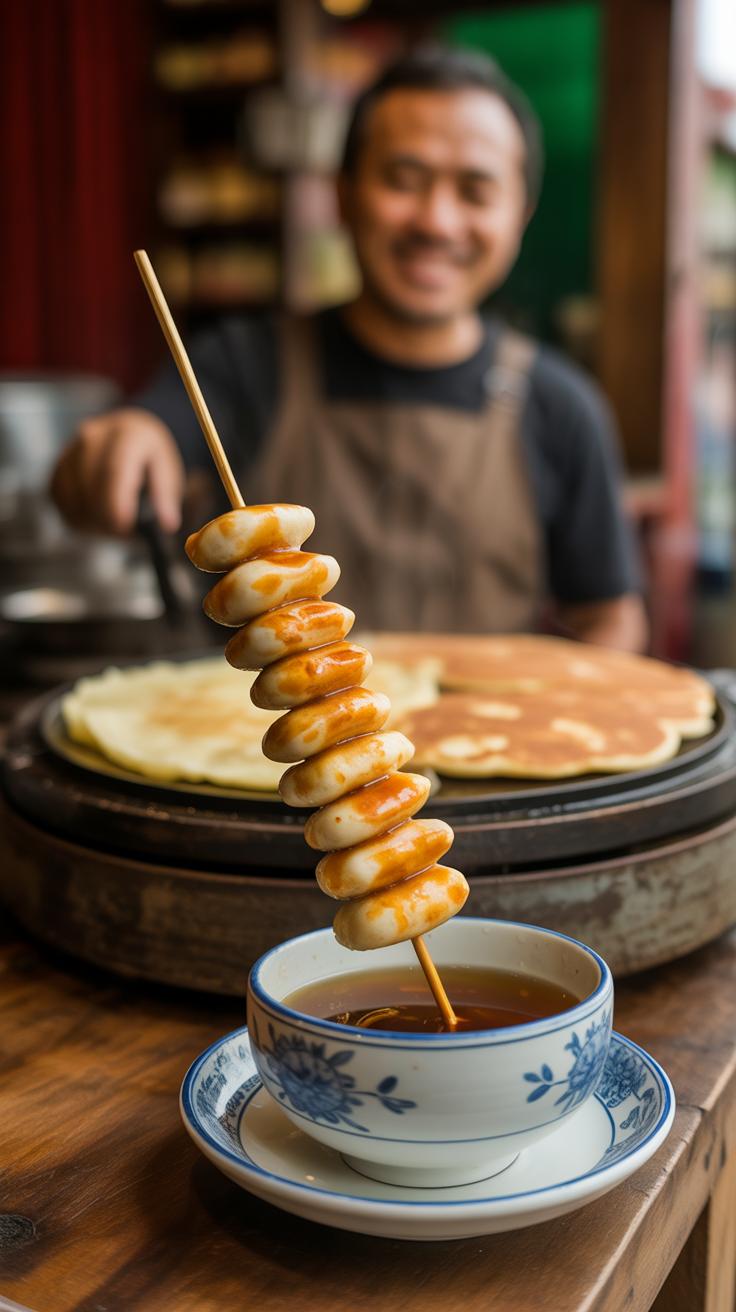 Skewered seafood is another popular choice. Squid, shrimp, or even fish cakes are threaded onto skewers and grilled over open flames or hot plates. Vendors often brush on soy-based sauces mixed with a bit of sugar or chili paste, giving a savory-sweet contrast. The combination of char and glaze makes these skewers sticky and flavorful — a perfect handheld snack as you stroll through the market.