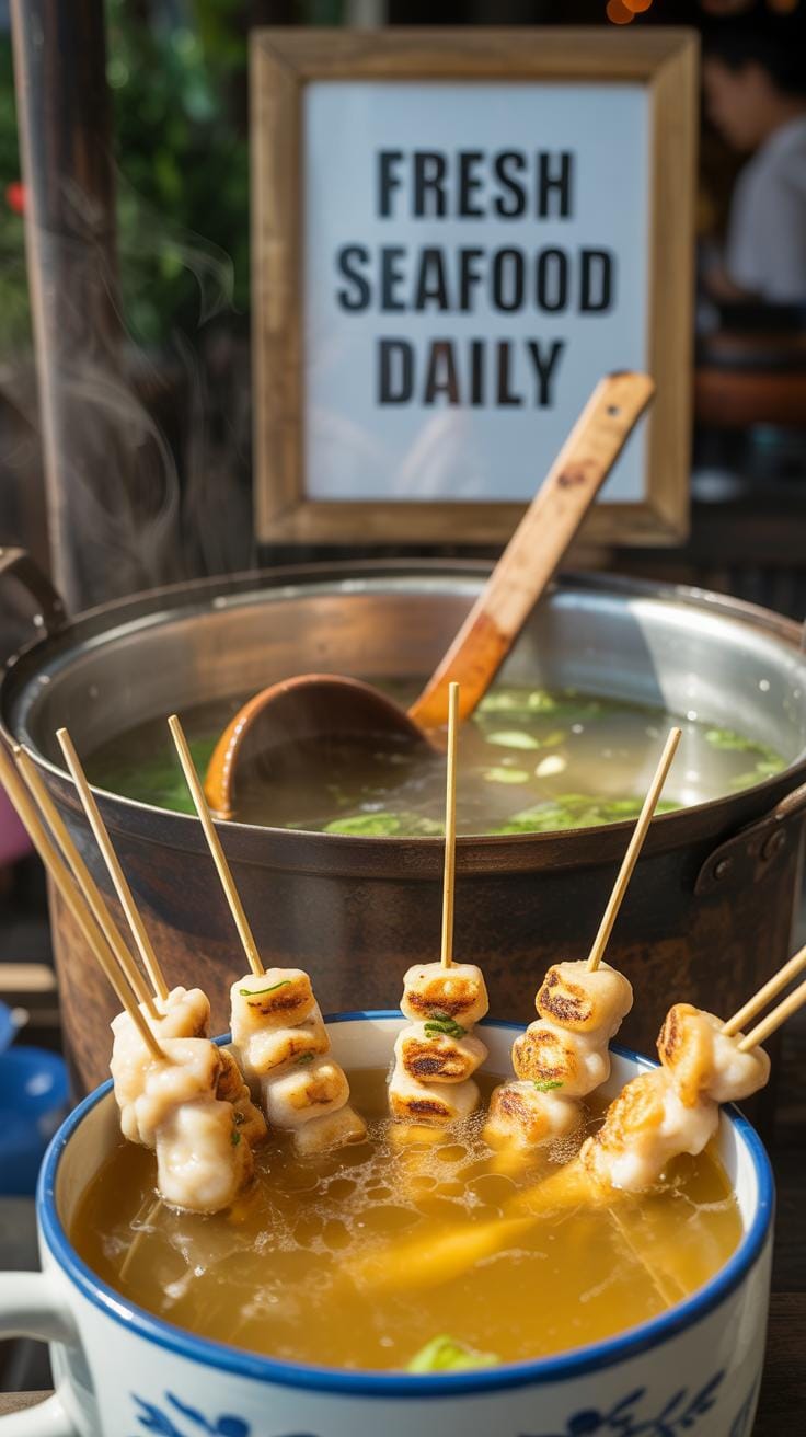 You’ll most commonly see eomuk served threaded onto wooden skewers, making it easy to eat while you wander. It’s usually dipped in a hot, clear broth that’s kept warming on the stall, so you can sip the soup alongside the fish cake. Some places serve it in a small paper cup filled with broth, turning the snack into a quick mini meal. Street vendors often add their own twist, sometimes offering spicy or soy-based sauces. There’s something about holding that warm skewer, maybe with a bit of the broth’s heat lingering, that makes fish cake a go-to comfort on Korean streets.