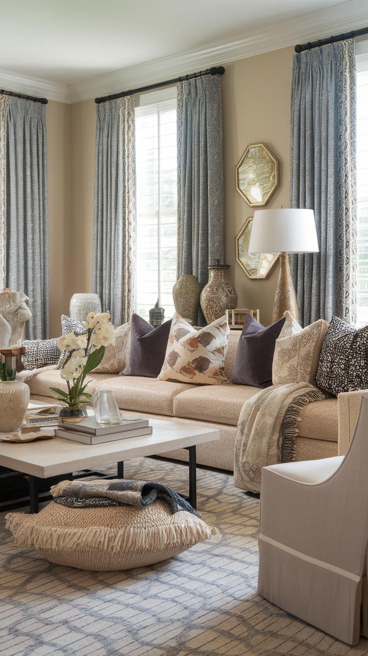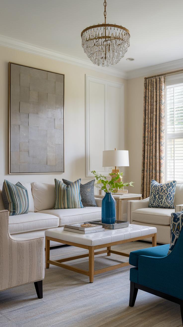 To ensure a cohesive look, use these colors consistently in your furniture, accessories, and artwork. This approach can help you build a stylish living room that captures the eye and feels welcoming to everyone.
