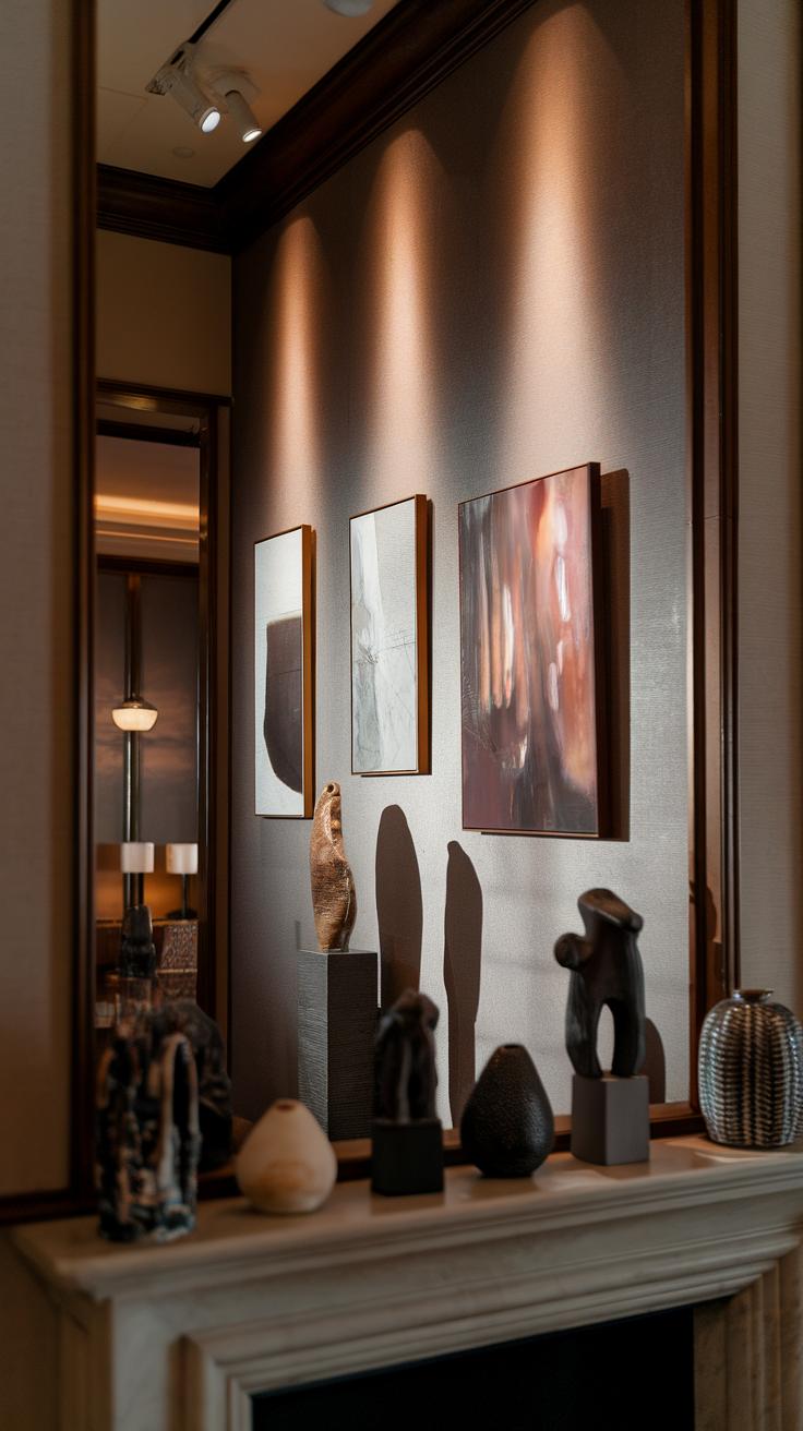 Choosing the right artwork brings a moody living room to life. Look for pieces that evoke strong emotions, such as abstract paintings in dark hues or dramatic landscapes. These artworks can create a striking focal point on a wall, setting a dramatic tone for the entire space. When you hang these pieces, consider their size and placement to enhance the overall depth of the room. Large canvases command attention, while smaller pieces can cluster together for a gallery feel.