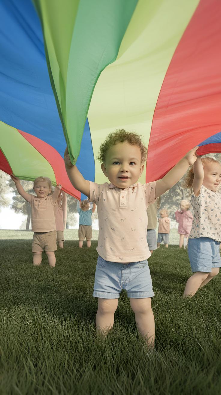 “Parachute Play” with a colorful fabric promotes teamwork as children lift and lower it together. Singing songs during games adds a bonding element.