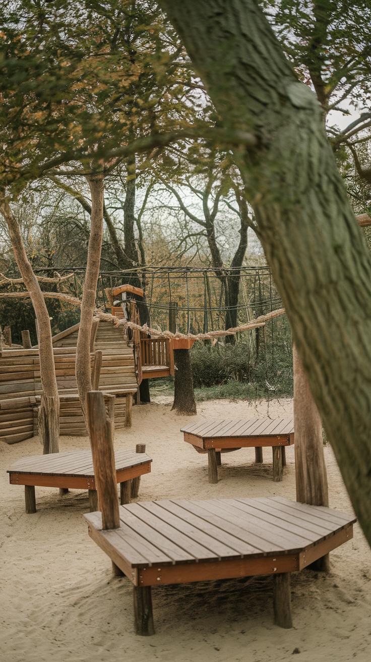 Using wood, stones, and plants in your design can make the playground feel more connected to the environment. Wood works well for building climbing structures, balance beams, or benches. Its texture and warmth offer a natural feel that plastic can’t match.