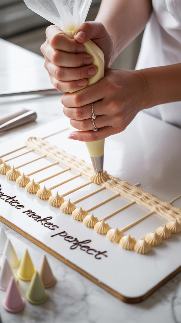 Trying these simple shapes repeatedly—on parchment or a leftover cake scrape—helps build confidence. Don’t expect perfection at once; I often find my first attempts a bit wonky. But there’s something satisfying about seeing those neat dots or steady lines take shape after a little practice. Once simple shapes feel familiar, you’ll be ready to experiment more.