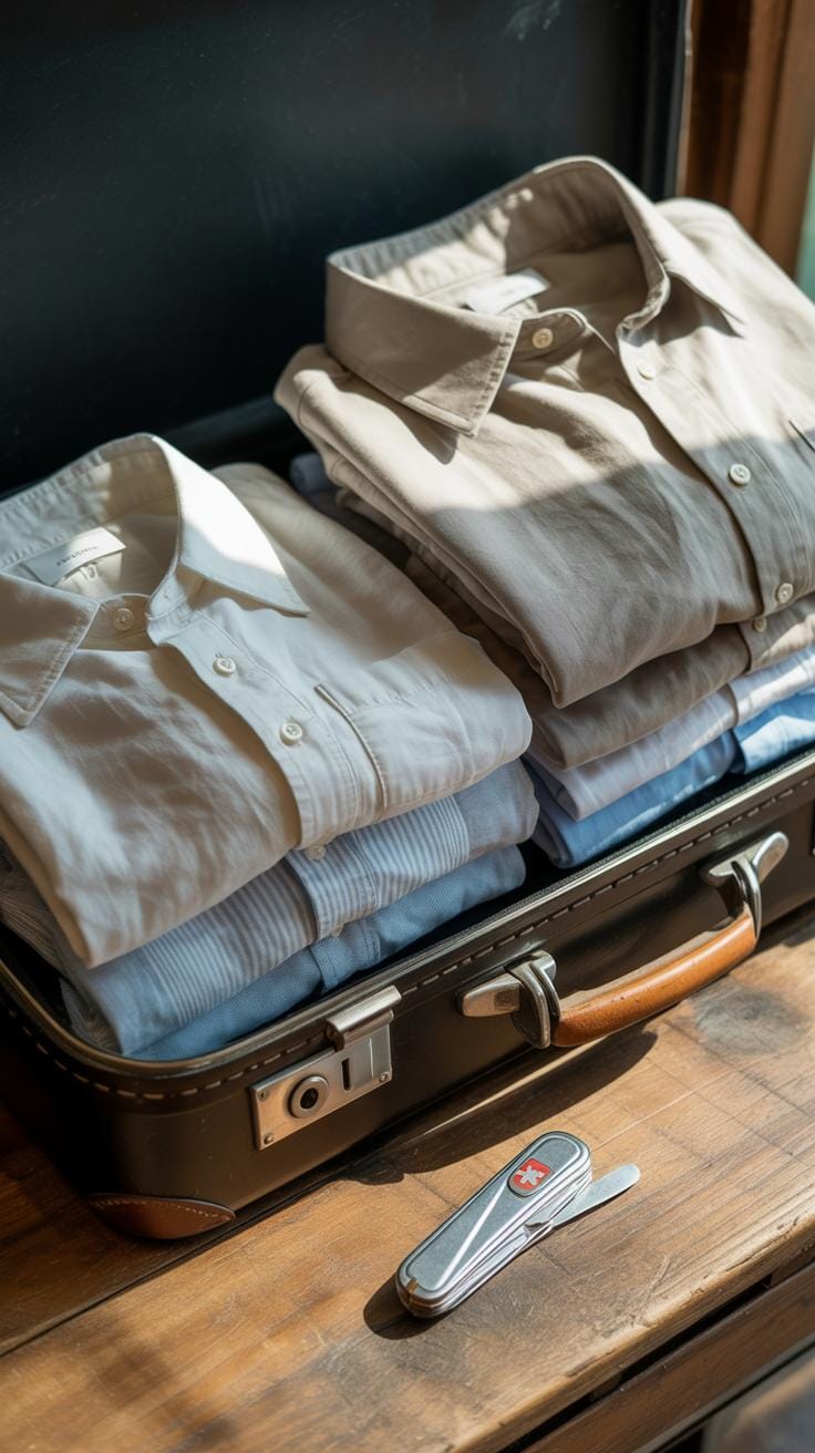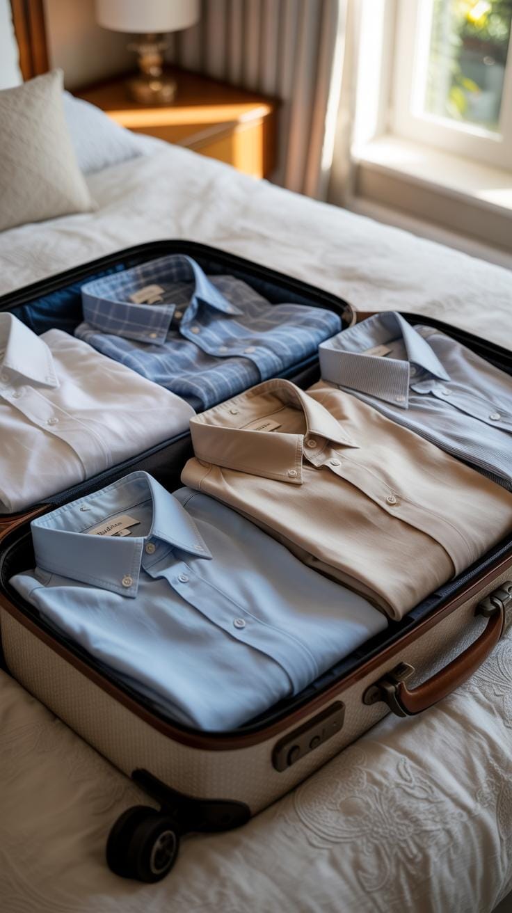 Wrinkles don’t have to spoil your look. Rolling clothes instead of folding helps reduce creases—and it saves space, too. If wrinkles appear, hanging items in a steamy bathroom can smooth them out mildly. Just don’t forget your shirts while you shower.