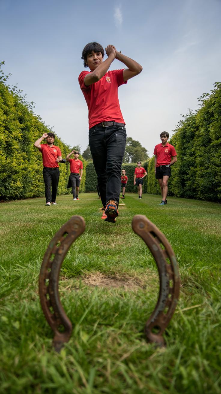 Traditional horseshoes weigh around 2.5 pounds each. The stakes are usually 1 inch in diameter and should stand about 15 inches above the ground, tilted slightly toward each other. You can mark the foul line about 37 feet from the opposite stake to set a limit for your throws. This setup creates a clear target zone and space to compete comfortably.
